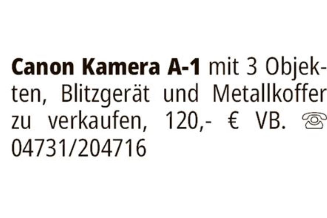 Canon Kamera A-1 mit 3 Objekten, Blitzgerät und Metallkoffer zu verkaufen, 120,- € VB. 04731/204716