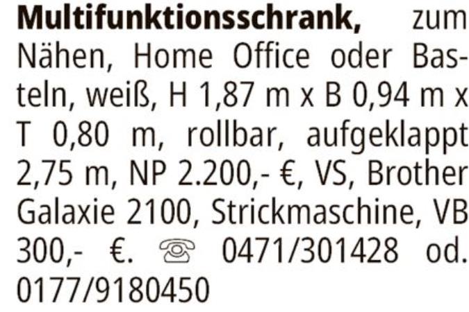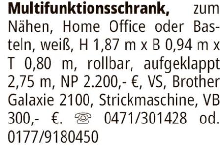 Multifunktionsschrank, zum Nähen, Home Office oder Basteln, weiß, H 1,87 m x B 0,94 m x T 0,80 m, rollbar, aufgeklappt 2,75 m, NP 2.200,- €, VS, Brother Galaxie 2100, Strickmaschine, VB 300,- €. 0471/301428 od. 0177/9180450