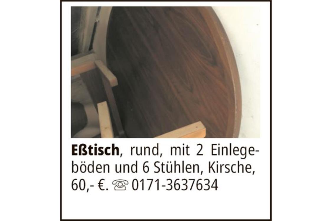 Eßtisch, rund, mit 2 Einlegeböden und 6 Stühlen, Kirsche, 60,- €. V 0171-3637634