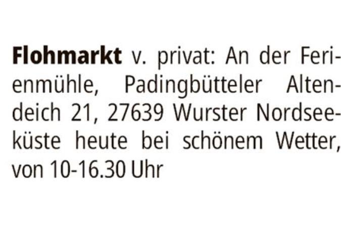 Flohmarkt v. privat: An der Ferienmühle, Padingbütteler Altendeich 21, 27639 Wurster Nordseeküste heute bei schönem Wetter, von 10-16.30 Uhr